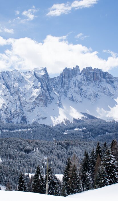 „Meine Lieblingswanderung, auf die mich immer mein treuer Hund Filou begleitet, startet direkt vor meiner Haustür in Carezza und bringt uns an einen der schönsten Orte der Gegend! Vom Grand Hotel aus führt uns die Wanderung über den gespurten Wanderweg Nr. 6 und dann auf den Weg Nr. 16 Richtung Moseralm. Ab da gelangen wir über den leicht ansteigenden Weg Nr. 16 zu den Frin-Wiesen, wo sich uns eine atemberaubende Sicht auf die Dolomiten-Bergwelt öffnet. Die sonnenverwöhnten Wiesen verwandeln sich im Winter in ein Wunderland und laden zum Verweilen ein. Auch wenn ich Rosengarten, Latemar und die umliegende Bergwelt schon hundert Mal vor meiner Linse hatte, so kann ich auf meine Spiegelreflexkamera doch nie verzichten.