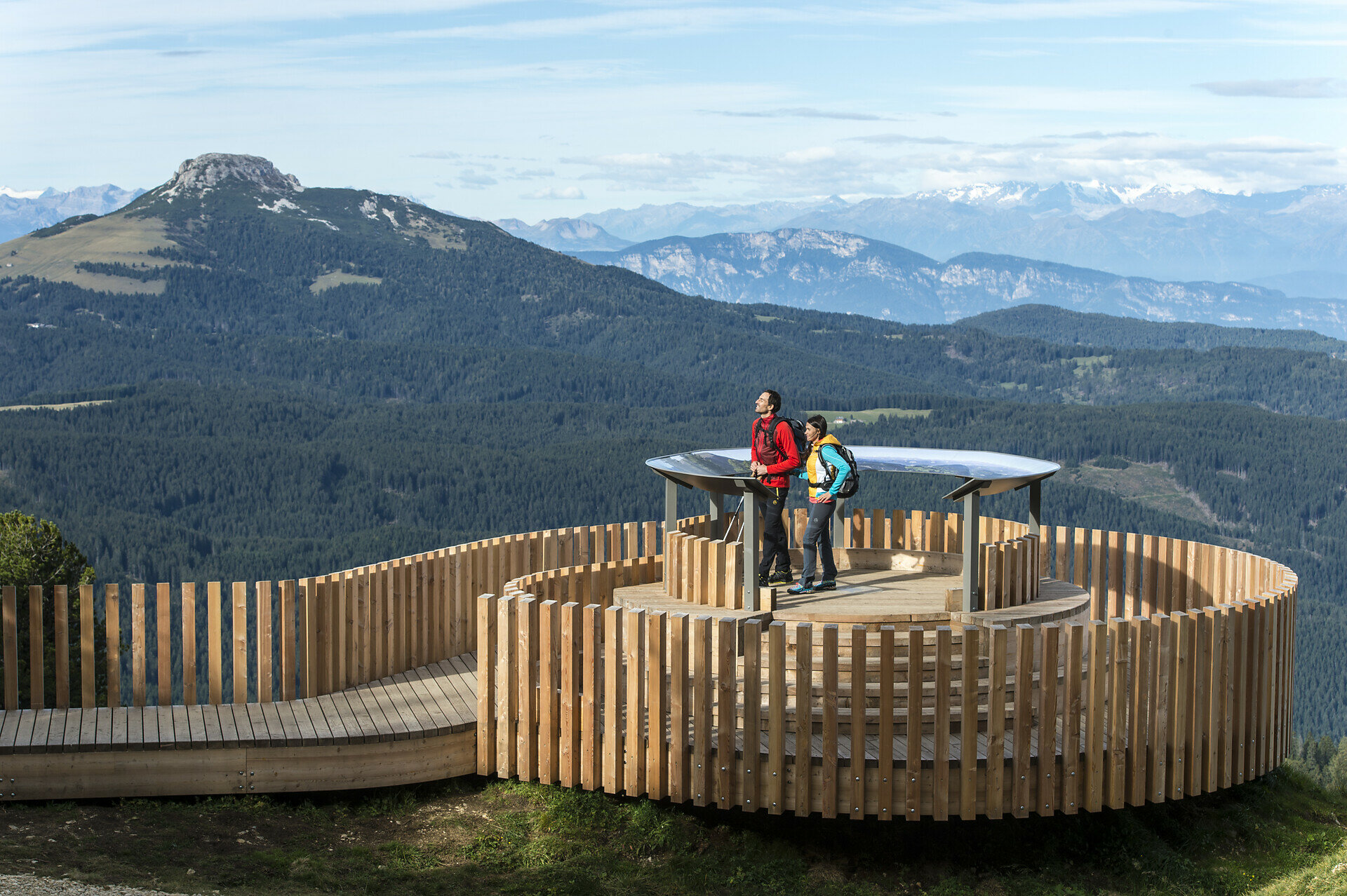 In Obereggen, drop off the e-bike and take the Oberholz chairlift up to the hut. From there, trail [18] leads in 10 minutes to the Latemar 360° platform, followed by the Latemar Panorama Trail to the Mayrl Alm.