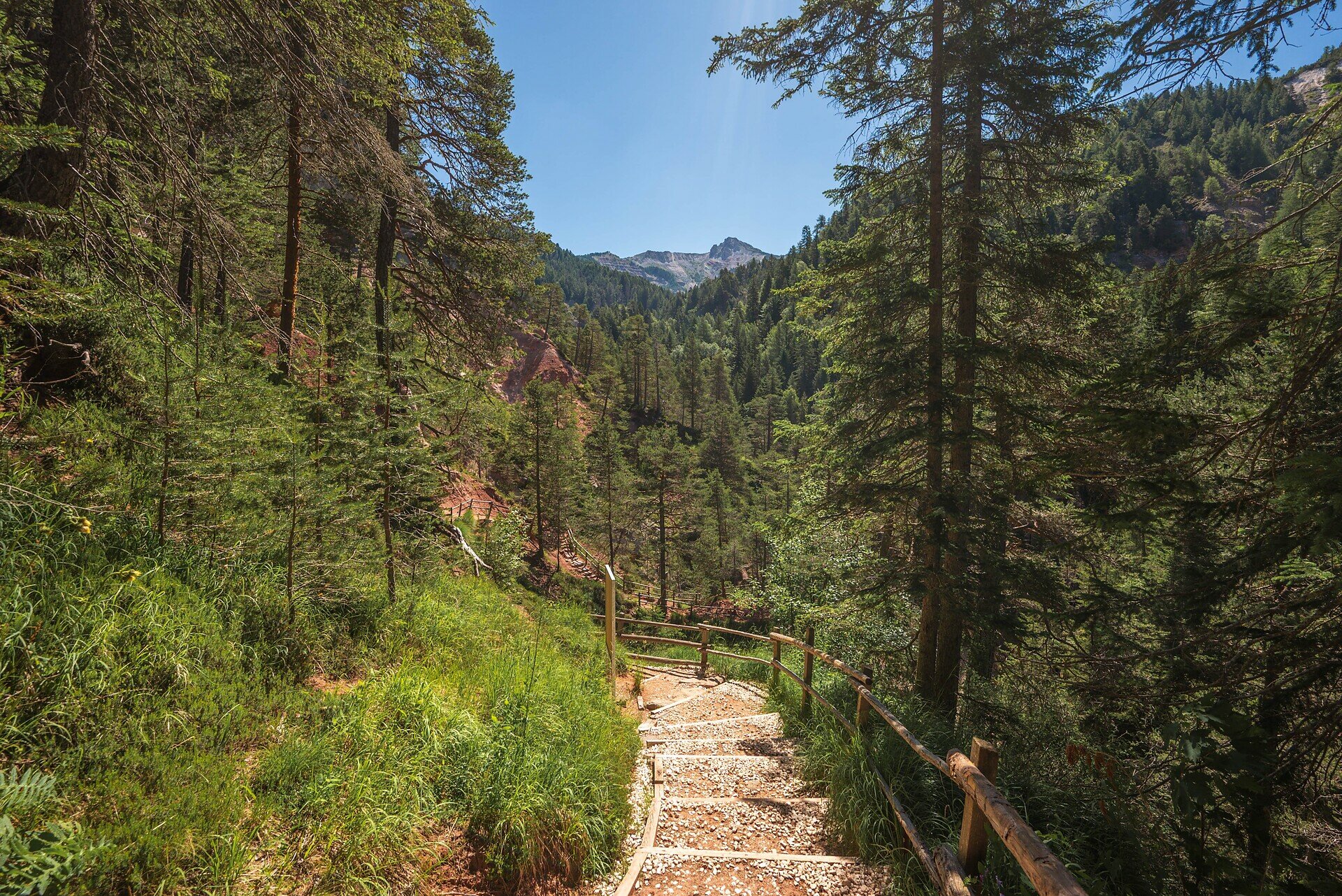 Da qui, il sentiero scende nella gola del Bletterbach, dove si apre un paesaggio geologico affascinante. Prima di scendere nella gola, è necessario recarsi al centro visitatori di Aldino per ritirare un casco protettivo. L'ingresso costa 9 €. I bambini e ragazzi fino a 11 anni (inclusi) entrano gratuitamente. Dopo la discesa, si continua sul sentiero [3] attraverso la tranquilla valle Kösertal, con belle vedute sul Corno Bianco.