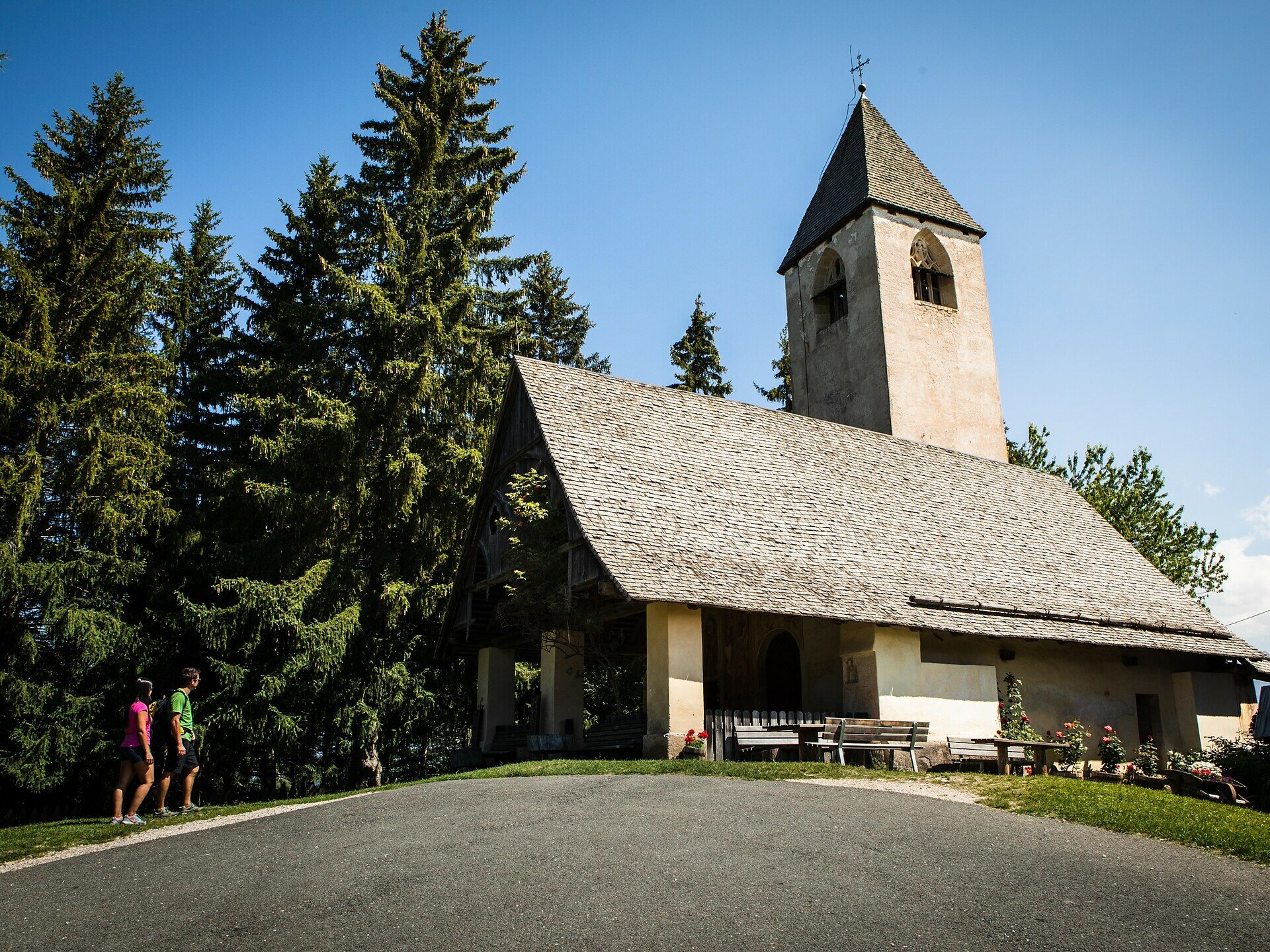 The hike starts in the village center of Deutschnofen (1,357 m). Walk toward the village entrance/roundabout, then follow the road in the direction of Bolzano. Shortly after, you’ll reach the Pfösl chapel, set on an open meadow. Continue a bit further and take the second path on the left, which becomes the St. Helena trail. This gentle route through forests and fields leads directly to the St. Helena Church (approx. 1,400 m), beautifully located on a hill with stunning views.