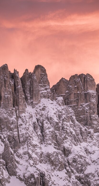 Der sagenhafte Rosengarten ist eine Gebirgsgruppe der Dolomiten und erstreckt sich zwischen dem Tierser Tal, dem Eggental und dem Fassatal. Hier erwarten BesucherInnen nicht nur 500 Wanderkilometer, 7 Klettersteige, zahlreiche alpine Kletterrouten und und im Skigebiet Carezza auch spannende Skipisten: Seine Westseite hat eine Silhouette mit Wiedererkennungswert, die sich sogar von Bozen aus bestaunen lässt. Im Sonnenuntergang „blüht“ bzw. glüht der Rosengarten übrigens in feurigem Rosenrot: Dafür ist das Phänomen des Alpenglühens, auch Enrosadira genannt, verantwortlich – oder, wenn man der Sage glaubt, König Laurins Zauberspruch.